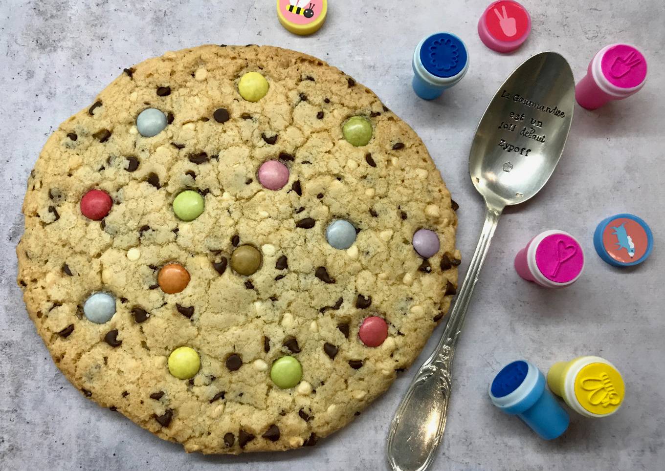 Comment ne pas résister à ce cookie format XXL aux pépites de chocolat et aux Smarties ? Nul besoin de couteau pour découper ce gâteau, cassez directement avec vos mains, le morceau à la hauteur de votre gourmandise. Ce cookie géant n’a pas fait long feu à la maison et a été dévoré en quelques bouchées.