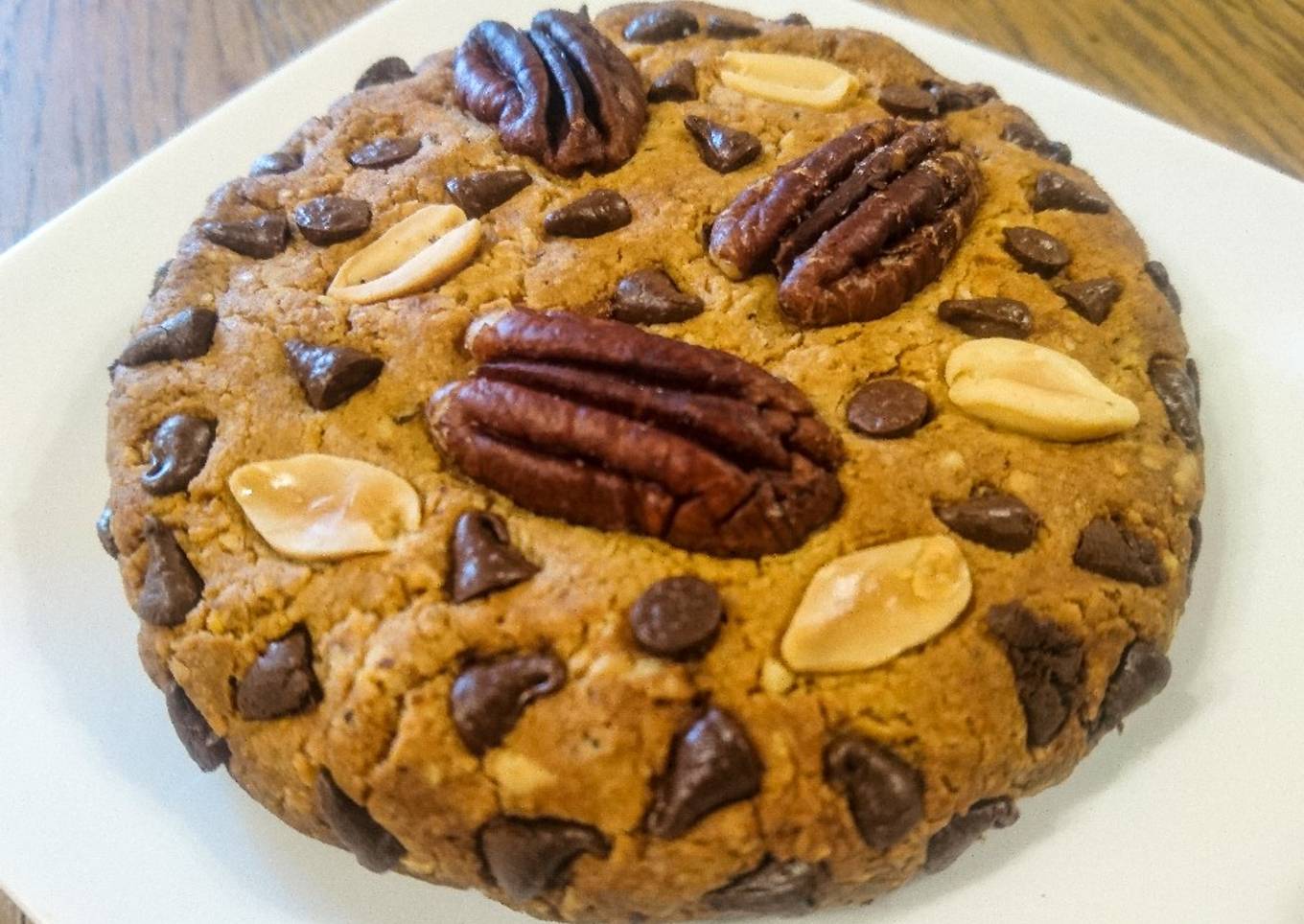 - Faites chauffer votre four à 180 degrés. Formez votre cookie, ajoutez les pépites de chocolat noir, les cacahuètes et les noix de pecan sur le dessus. Enfournez pendant environ 10 minutes, baissez votre four à 160 degrés et laissez cuire encore 5 à 10 minutes.